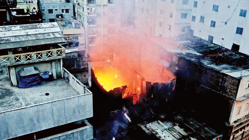 Smoke and sparks rise after a fire broke out on the third floor of a three-storey residential building in Old Dhaka’s Chawk Bazar area yesterday. It took more than an hour for seven units from Lalbagh, with support from Palashi, Hazaribagh and Siddiq Bazar fire stations, to douse the blaze. The cause of the fire could not be known immediately. No casualties were reported. Photo: Star